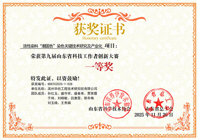 近日,在第九屆山東省科技工作者創(chuàng)新大賽決賽中,公司工程技術(shù)研究院團(tuán)隊(duì)研發(fā)的“活性染料‘潮固色’染色關(guān)鍵技術(shù)研究及產(chǎn)業(yè)化”項(xiàng)目,經(jīng)多輪嚴(yán)格評審,從282個(gè)入圍決賽的優(yōu)秀項(xiàng)目中脫穎而出,榮獲大賽一等獎(jiǎng)。